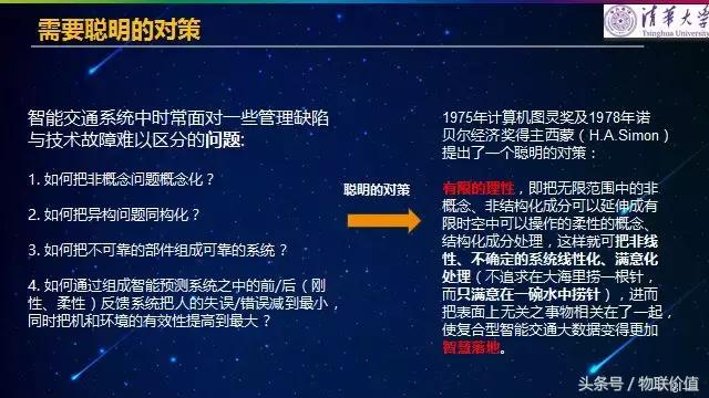 由于這些數(shù)據(jù)的數(shù)據(jù)量大,類型多,智能交通系統(tǒng)時常需面對一些管理缺陷與技術故障難以區(qū)分的問題,那基于現(xiàn)在的情況,我們?nèi)绾稳ソ鉀Q? 1975年計算機圖靈獎及1978年諾貝爾經(jīng)濟獎得主西蒙(H.A.Simon)提出了一個聰明的對策:有限的理性,即把無限范圍中的非概念、非結(jié)構化成分可以延伸成有限時空中可以操作的柔性的概念、結(jié)構化成分處理,這樣就可把非線性、不確定的系統(tǒng)線性化、滿意化處理,進而把表面上無關之事物相關在了一起,使復合型智能交通大數(shù)據(jù)變得更加智慧落地。