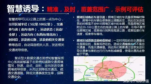 智慧誘導可以精準,及時的進行引流。用戶上路之后,如果收到一些信息,大部分人認為是無效的,但是實際上收到的信息對特定區(qū)域和特定人群是很有意義的。這里分為擁堵區(qū)域臨近車流引流和擁堵區(qū)域道路流量峰值削減。擁堵區(qū)域臨近車流引流指擁堵區(qū)域的車流量很難瞬時降低,擁堵中的車輛也很難做出調(diào)整改變,因此在發(fā)送信息的時候是不會針對擁堵區(qū)域中的車輛,而是擁堵區(qū)域附近20-100公里左右的高速公路上的車輛,引導不要開往擁堵區(qū)域,或者繞行到其他高速公路,或者延緩行車速度,或者停車等待。而擁堵區(qū)域道路流量峰值削減指一定時間段的總交通量往往是固定的,是客觀存在的。造成交通癱瘓的并不是總交通量,而是交通峰值。因此我們需要通過信息發(fā)送引導交通參與者的出行行為來削減峰值,使得交通流走勢趨于平緩。