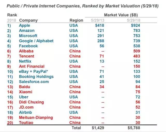 “互聯(lián)網(wǎng)女皇” Mary Meeker在2018年的報(bào)告中指出,全球20個(gè)市值或估值最大的互聯(lián)網(wǎng)公司中,以阿里巴巴為首的中國企業(yè)就占據(jù)了9家,美國有11家。