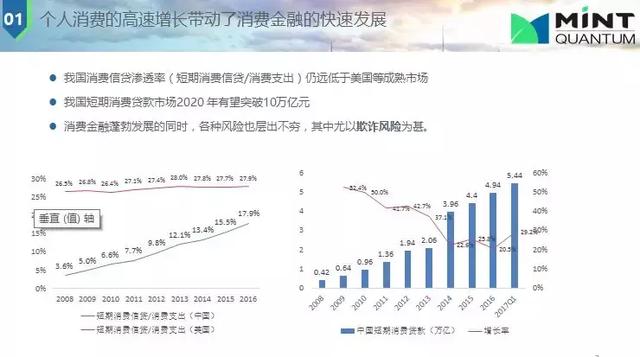 美國是個人消費(fèi)實(shí)力很強(qiáng)的一個國家,我們以它為標(biāo)桿。圖中藍(lán)線代表中國,紅線代表美國。預(yù)測中國短期個人貸款到2020年達(dá)10萬億元,可見市場龐大。個人消費(fèi)不僅僅靠大銀行,還要靠其他小型機(jī)構(gòu);因?yàn)榇筱y行本身這種特點(diǎn)(客群優(yōu)質(zhì)),很難下放到下層服務(wù)。在信用風(fēng)險(xiǎn)中欺詐風(fēng)險(xiǎn)在我國占的比例非常高,數(shù)額也比較大,經(jīng)常是有組織的欺詐,如做“網(wǎng)絡(luò)黑產(chǎn)”有百萬級人員,市場規(guī)模為千億級,很多公司被迫無法經(jīng)營,據(jù)估計(jì),互聯(lián)網(wǎng)金融一半以上的壞賬風(fēng)險(xiǎn)來自欺詐風(fēng)險(xiǎn)。對比美國這方面比例就相對小的很多,如一個千億級個人消費(fèi),中能達(dá)20-30億美元,美國則只有幾千萬美元。原因有一點(diǎn)是美國征信做的比較好,幾乎覆蓋所有成年人。反欺詐就是提高欺詐的成本。
