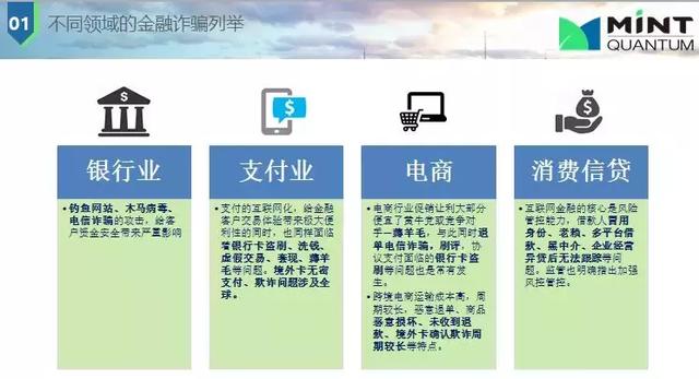 接下來介紹下不同領(lǐng)域的金融欺詐類型,如銀行業(yè)釣魚網(wǎng)站,木馬病毒,做一個假的網(wǎng)站;電商行業(yè)促銷讓利大部分便宜了黃牛黨或競爭對手—薅羊毛,與此同時退單電信詐騙,刷評,協(xié)議支付面臨的銀行卡盜刷等問題也是常有發(fā)生;消費(fèi)信貸中借款人冒用身份、老賴、多平臺借款、黑中介、企業(yè)經(jīng)營異常貸后無法跟蹤等問題。