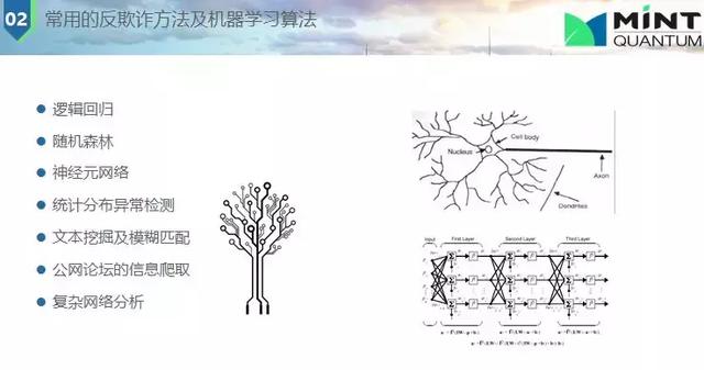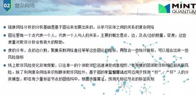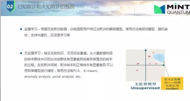 下面是欺詐與未知欺詐甄別問題,主要是監(jiān)督學(xué)習(xí)和非監(jiān)督學(xué)習(xí)。監(jiān)督學(xué)習(xí)是知道一個人以前欺詐(父母信息不對,電話號碼有誤等),我們就會打上標(biāo)簽,歷史數(shù)據(jù)就會訓(xùn)練我們的模型,統(tǒng)計(jì)模型所用數(shù)據(jù)大都都是有標(biāo)簽的;非監(jiān)督學(xué)習(xí)也是經(jīng)常使用的,因?yàn)槠墼p是經(jīng)常改變的或不同特征的,我并不知道他是否是欺詐,我們用關(guān)聯(lián)網(wǎng)絡(luò),每個人間有聯(lián)系,這種網(wǎng)絡(luò)快速發(fā)展;還有一種是兩者結(jié)合起來,利用權(quán)重評估。