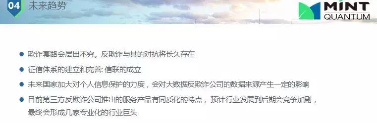 對未來一點(diǎn)展望,欺詐永遠(yuǎn)不會停止、不會消失,尤其在中國征信沒有完全建立,人口多,社會缺乏金融知識,對征信了解很少,收入差距比較大的環(huán)境下,欺詐現(xiàn)象會長期存在,這在風(fēng)控里面是考慮的一個重要部分。征信體系的建立和完善,雖然這個過程會很長;目前第三方反欺詐公司推出的服務(wù)產(chǎn)品有同質(zhì)化的特點(diǎn),預(yù)計(jì)行業(yè)發(fā)展到后期會競爭加劇,最終會形成幾家專業(yè)化的行業(yè)巨頭。